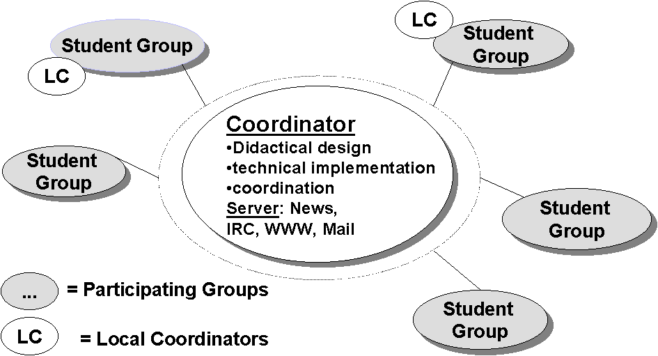 The special characteristics of this didactical design is the structured combination of synchronous and asynchronous communication based on a mixture of internet services and an appropriate combination of individual, group and inter-group learning.